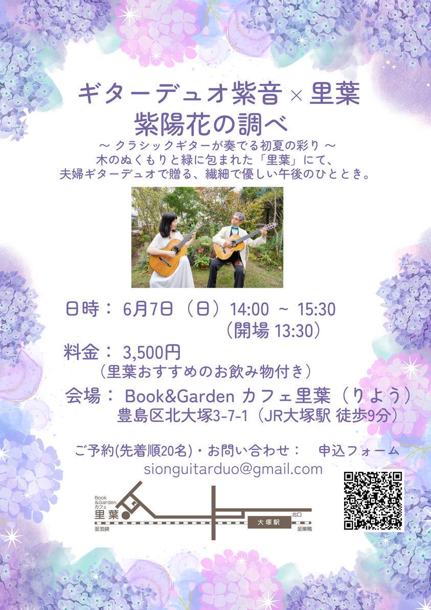 2026年4月7日 / 最終更新日時 : 2026年4月7日 info@riyou-bookgarden.com 6/7(日) 「ギターデュオ紫音 紫陽花の調べ」のお知らせ 6/7(日)、ギターデュオ紫音によるコンサート「紫陽花の調べ」を開催いたします。 紫音はご夫婦で活動されているクラシックギターデュオです。 美味しいお茶を飲みながら、ギターデュオ紫音のトークと音色をお楽しみいただければと思います。 新曲もあるそうです。先着20名。気になる方はお早めのお申し込みをお願いいたします。 日時:6月7日(日)14:00〜15:30(開場 13:30) 料金:3,500円(お飲み物付き) 開場:Book & Garden カフェ里葉 お申込:QRコードから